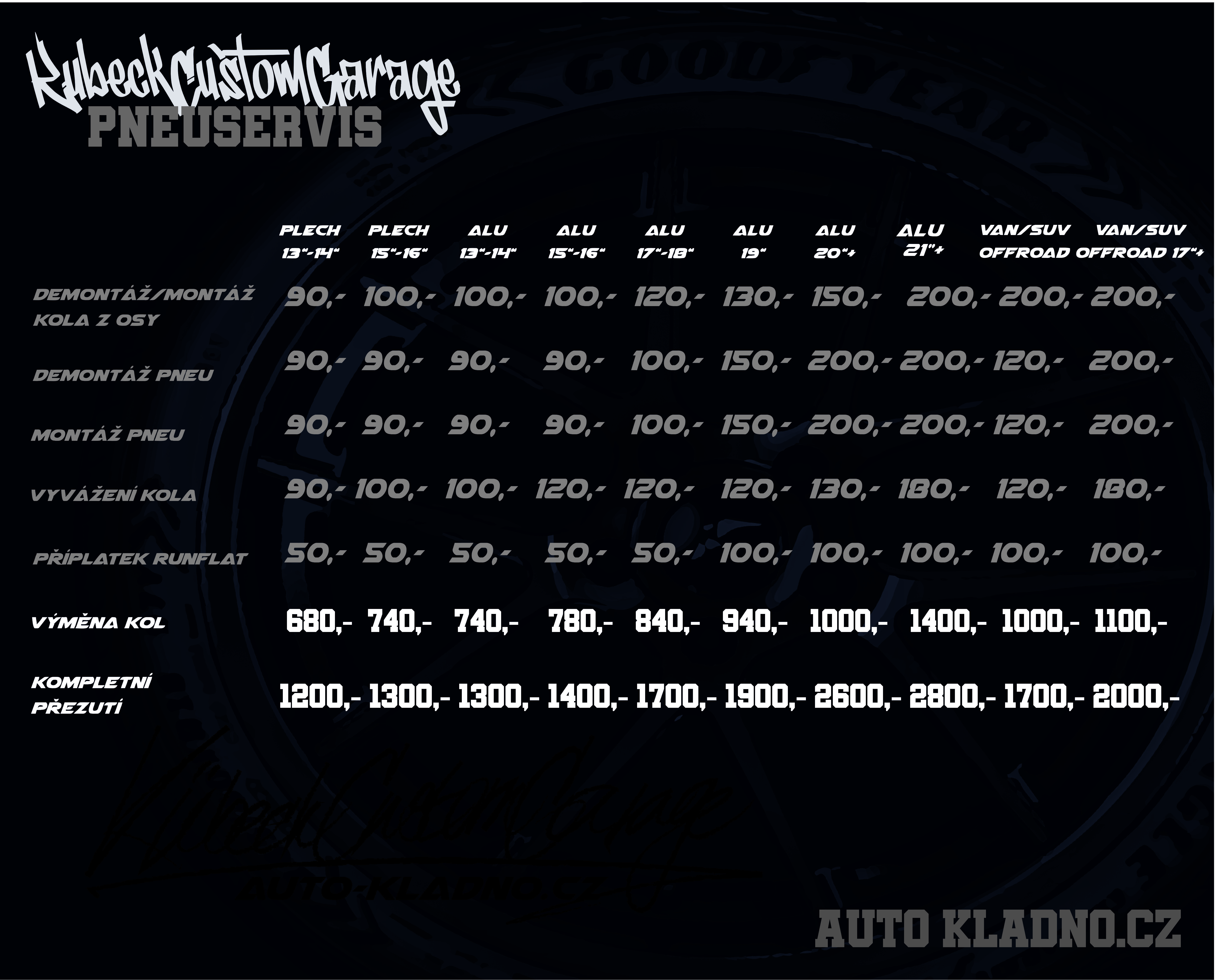 | PŘEZUTÍ kompletí přezutí celého vozidla | 1200,- | 1300,- | 1300,- | 1400,- | 1700,- | 1900,- | 2600,- | 1700,- | 2000,- |